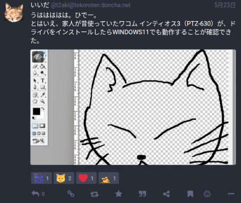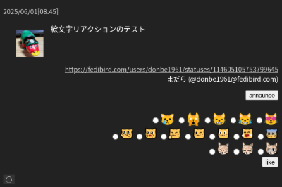 絵文字リアクションに対応しているfedibird.comで、絵文字リアクションをいただいてるわたしの投稿を表示。