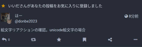 絵文字リアクションに対応していない別サーバーの別アカウントにunicodeの絵文字で泣き顔の猫「😿」を送ったのに「お気に入りに登録されました」となります。